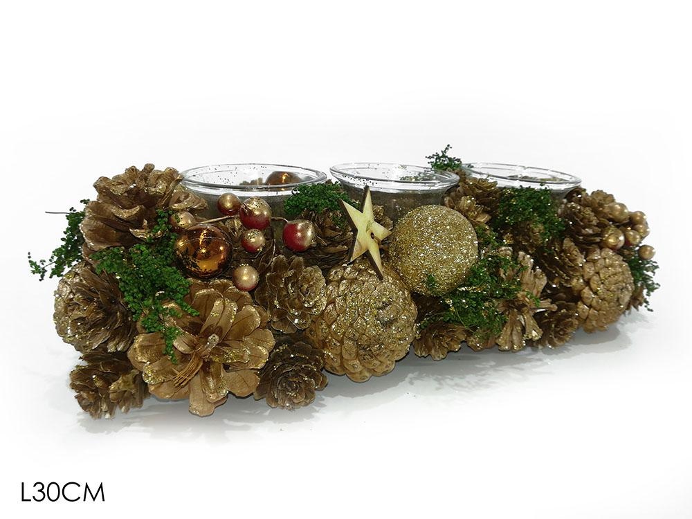PORTACANDELA ORO BRONZO 3posti CON PIGNE